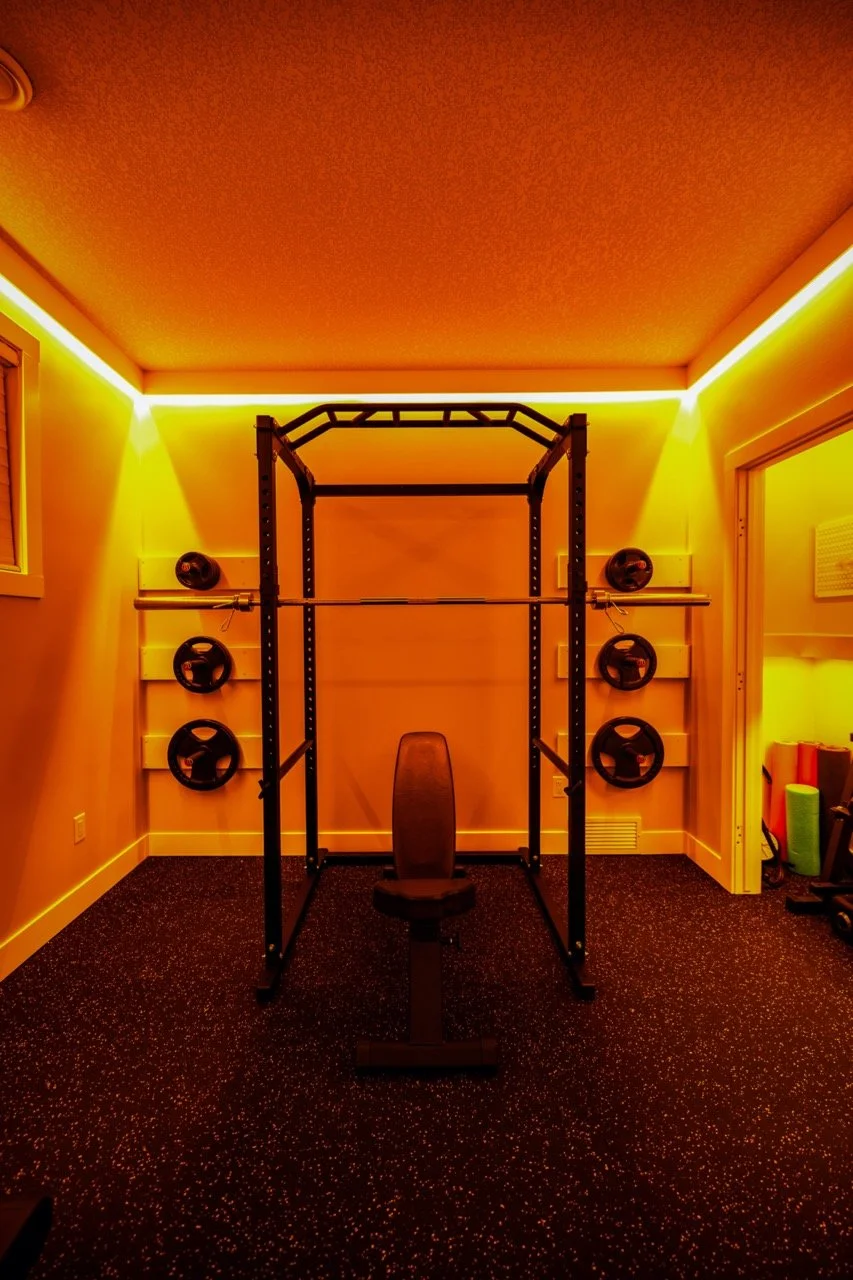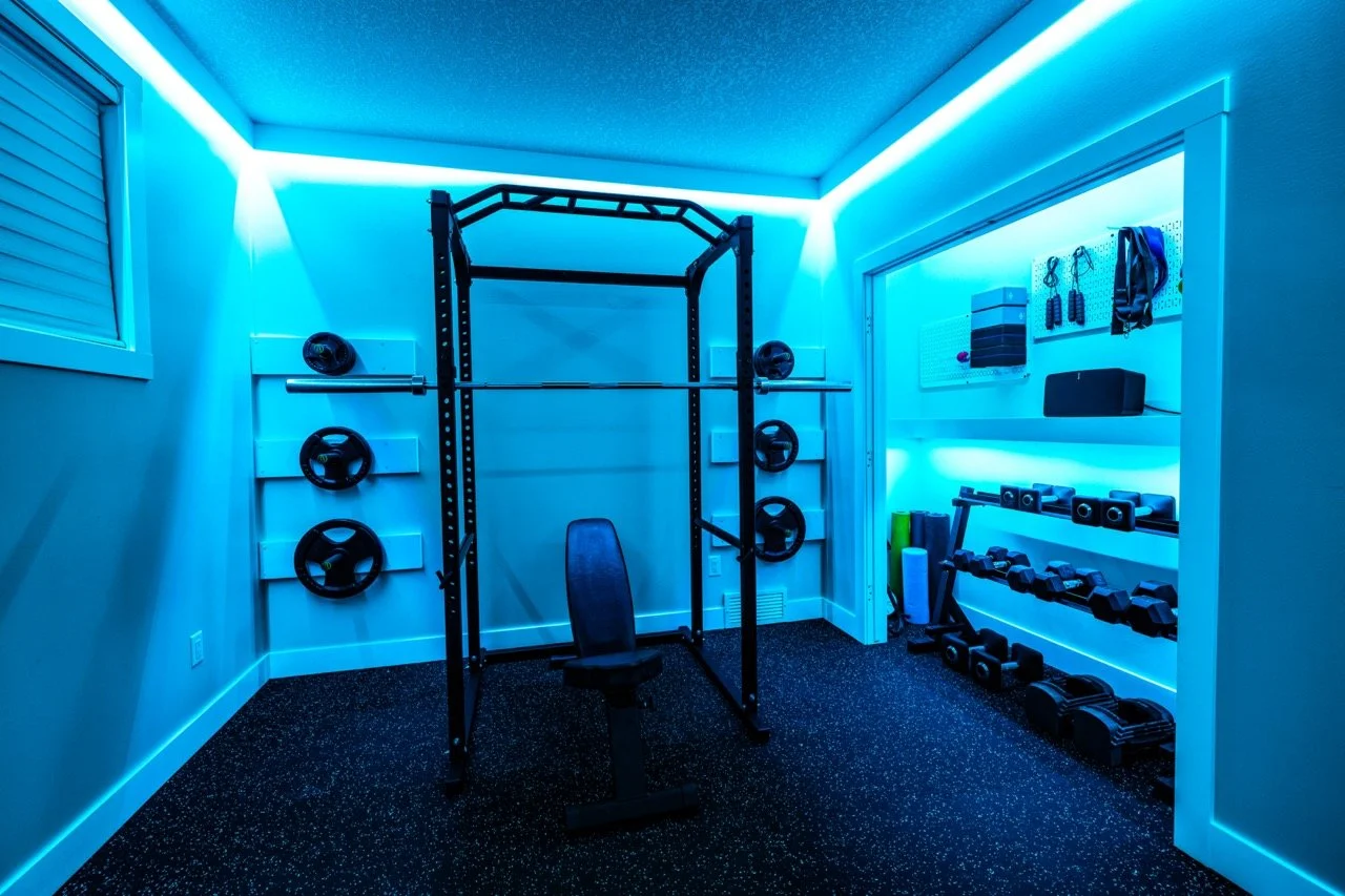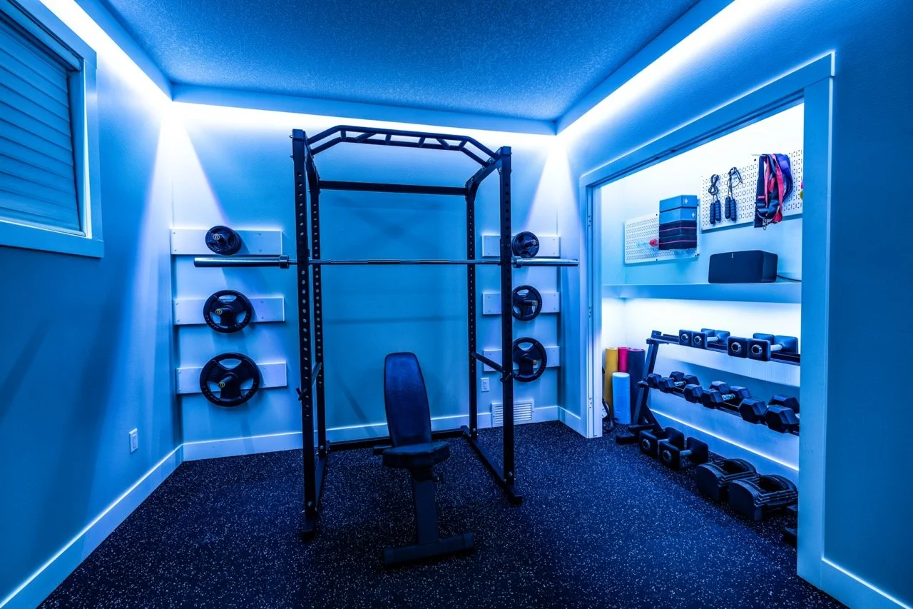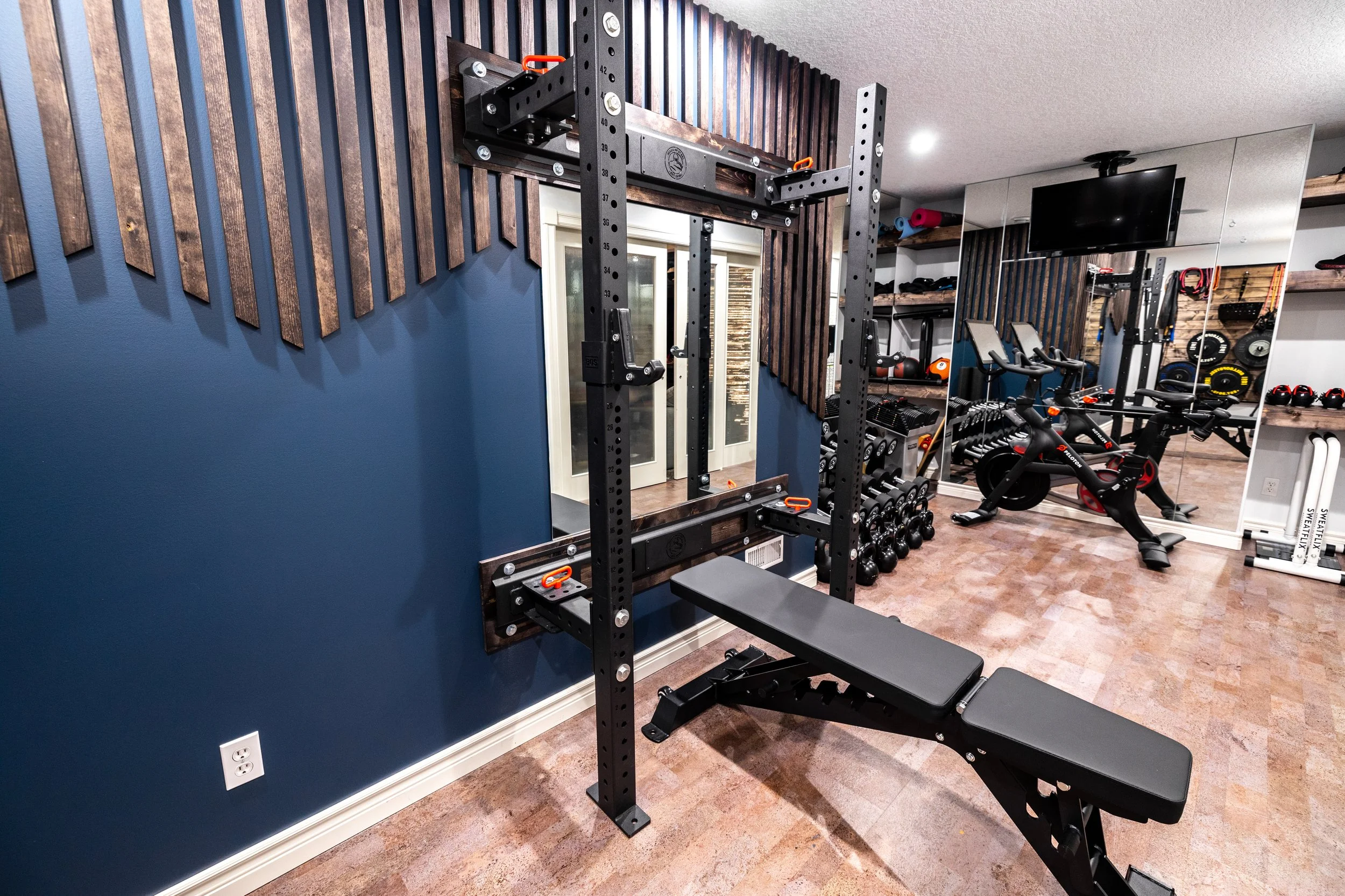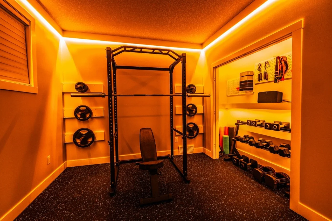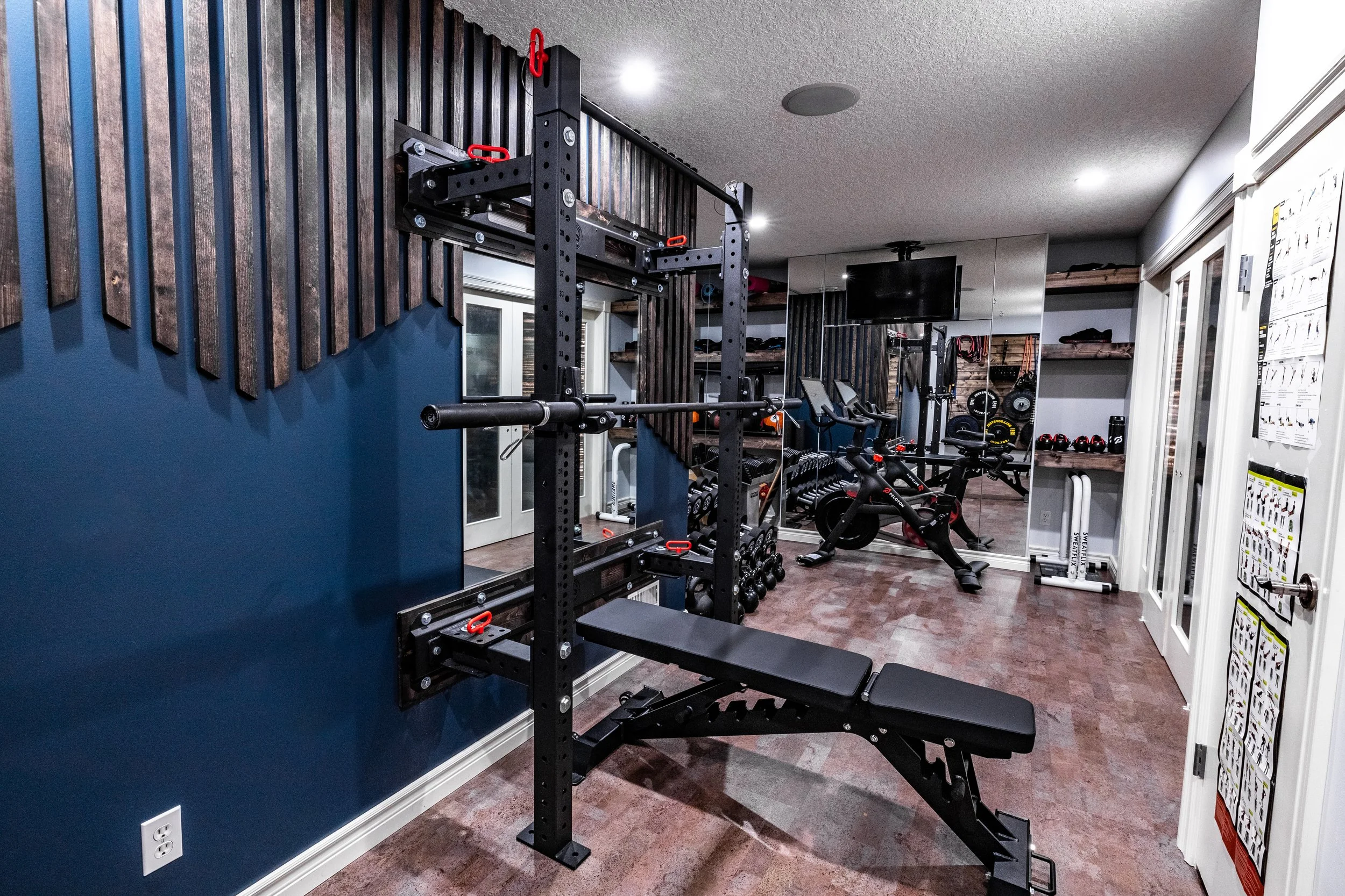 Golden Larch Design’s Home Gym — “The Showroom”, is the showcase for our Original Design option. If you like what you see, let us take the wheel and create a custom home gym unique for your space, with a similar style.